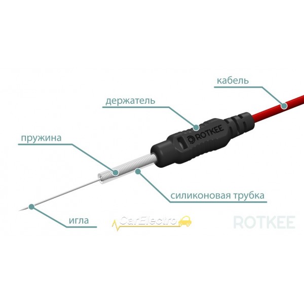 Replaceable measuring probes are made of soft cable in PVC insulation. The flexible stylus probe is ideal for connecting an oscilloscope to car jacks and other hard-to-reach places. A thin needle and a convenient holder allow you to connect to almost any connector without damaging the wiring, without violating the integrity of the circuit and the insulation of the electrical wiring, which will further protect it from premature corrosion. The spring protects the needle from accidental breaking.